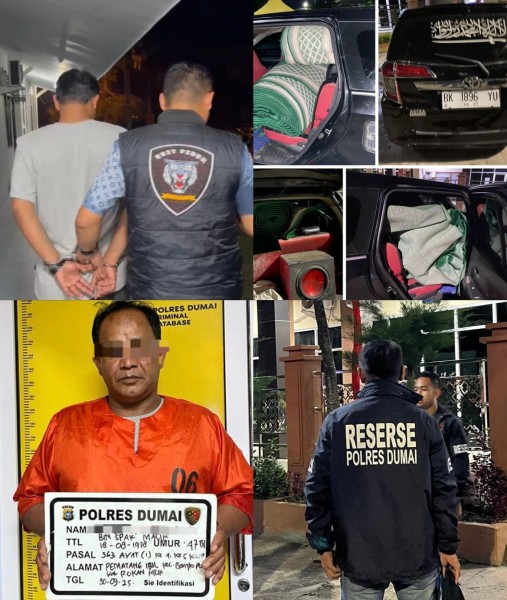 SUARAKRITIK.COM-Dumai, Riau – Jajaran Polres Dumai berhasil mengungkap kasus pencurian dengan pemberatan yang menyasar rumah ibadah di wilayah Kota Dumai. Tersangka, Malik Asip Ali (47), warga Rokan Hilir, diringkus setelah terbukti melakukan serangkaian aksi pencurian karpet dan sajadah di sejumlah masjid dan musala.