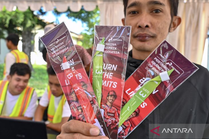 Pengunjung menunjukkan tiket MotoGP di Eks Bandara Selaparang, Mataram, NTB, Jumat (26/9/2025). Mandalika Grand Prix Association (MGPA) sebagai promotor MotoGP Mandalika 2025 menyiapkan sejumlah lokasi penukaran e-tiket ke tiket bentuk fisik mulai 26 September 2025 di Eks Bandara Selaparang dan Bazaar Mandalika. ANTARA FOTO/Ahmad Subaidi/agr